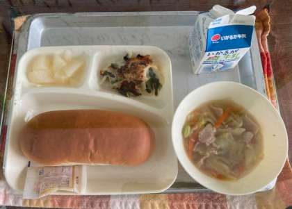 献立は、ほたて貝のグラタン、スープ、和なし(カット缶)、コッペパン、マーマレード、牛乳です。