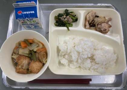 献立は、鶏肉のゆず塩焼き、あつあげと野菜の煮もの、こまつなの煮びたし、ご飯、牛乳です。