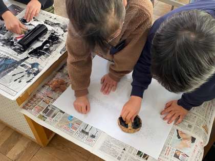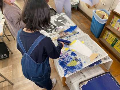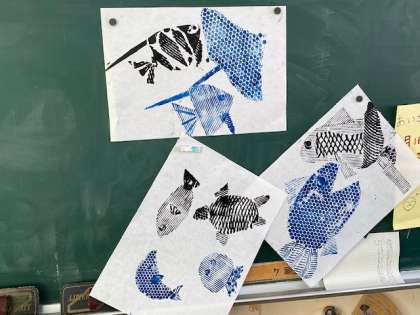 立体的な素材を使って魚を切り抜き、青や黒のインクで刷りました。