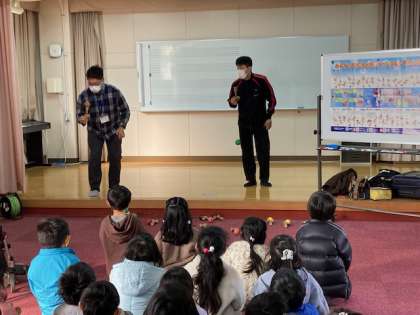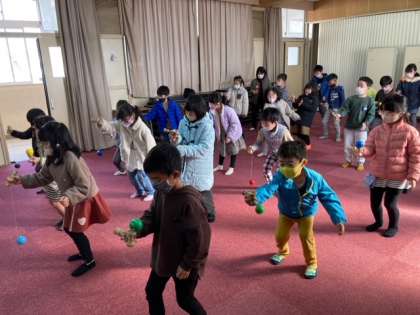 1年生と2年生が、けん玉名人の方とそのお弟子さんに来ていただき、けん玉を教えてもらいました。大皿、小皿、中皿に玉をのせたり、けん先で玉をとめるとめけんをしたりしました。けん玉の楽しさを味わうことができました。
