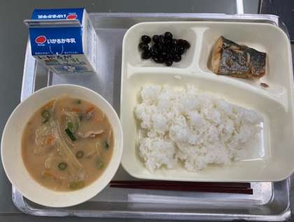 献立は、さごしのしょうゆだれかけ、みそ汁、黒豆の煮もの、ご飯、牛乳です。今日の給食には、おせち料理として黒豆の煮ものが登場しました。