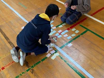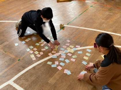 4年生は、講堂で百人一首をしました。