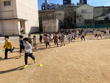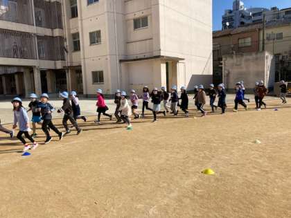 1年生と4年生が15分休み時間に、耐寒かけ足をしました。自分のペースで長く走ることが目標です。