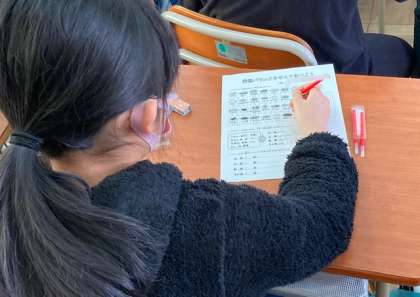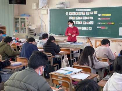 区内の栄養教諭から6年生に栄養指導をしてもらいました。「栄養バランスを考えて食べよう」をテーマに、バランスのよい献立になるように、主食、主菜、副菜を考え選びました。