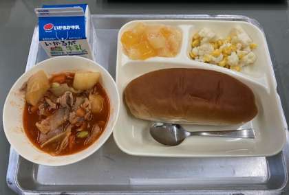 豚肉と野菜のケチャップ煮、カリフラワーのピクルス、フルーツゼリー、黒糖パン、牛乳です。