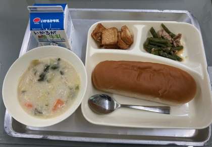 献立は、はくさいのクリーム煮、あつあげのごまじょうゆかけ、豚肉とさんどまめのオイスターソースいため、黒糖パン、牛乳です。