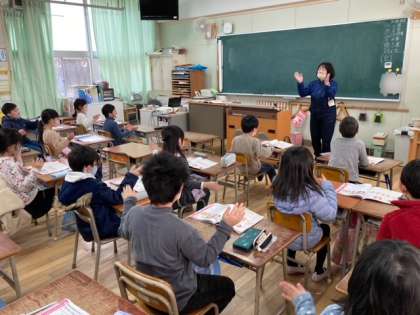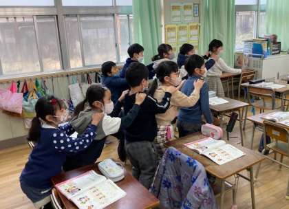 2年生が音楽でわらべうたを歌いました。歌に合わせて遊び方を覚えて、みんなで楽しみました。