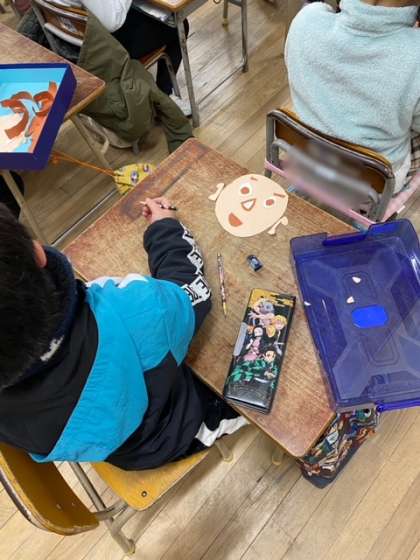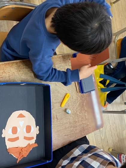 1年生は、図画工作科で紙版画を作っています。目、耳、鼻、眉毛、髪の毛など顔のパーツを作りました。
