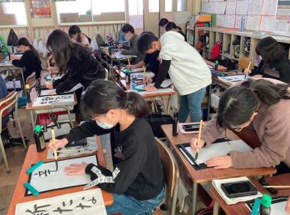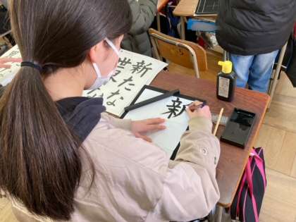6年生が書きぞめ「新たな世界」を書きました。半紙で練習した後に、書きぞめ用紙に書きました。ひらがなは漢字より少し小さく書くなど、字形に気をつけて書きました。できあがり何楽しみです。