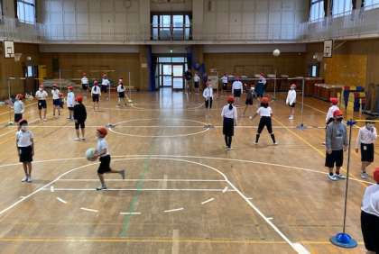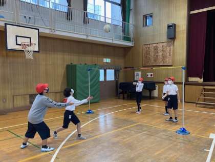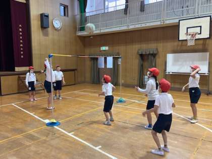 4年生が体育館で、ソフトバレーボールをしました。軽量のボールを片手、両手を使って味方にパスしたり、相手コートに返球したりして、ラリーを続けました。