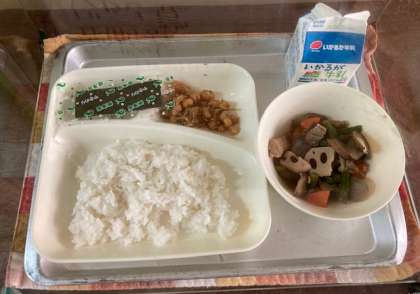 献立は、筑前煮、じゃこ豆、焼きのり、ご飯、牛乳です。