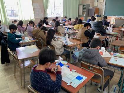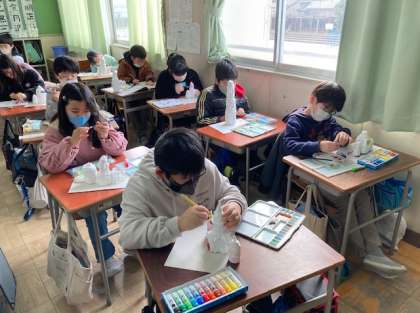 4年生が紙粘土でお城を作っています。個性あふれるお城ができています。今日はお城に色づけをしました。とても集中して丁寧に色づけをしていました。