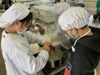 感染対策を考え、学級を2つに分けて調理実習をしました。班のメンバーと協力して作ったみそ汁は、おいしかったです。
