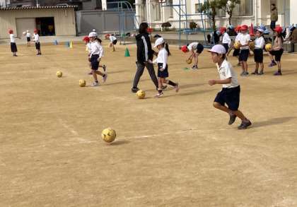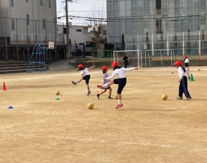 2年生が体育でボール遊びをしました。ボールをドリブルして、最後はシュートをしました。足を振り上げて思いっきりシュートをしていました。