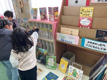 週1時間の図書の時間に、本の返却と貸し出しをした後、好きな本を読みました。新しい本が展示され貸し出されています。子どもたちが本を手に取りやすいように、図書館司書の方がレイアウトしてくれています。