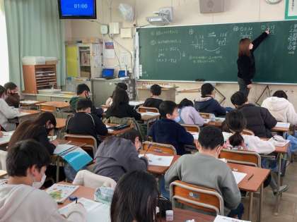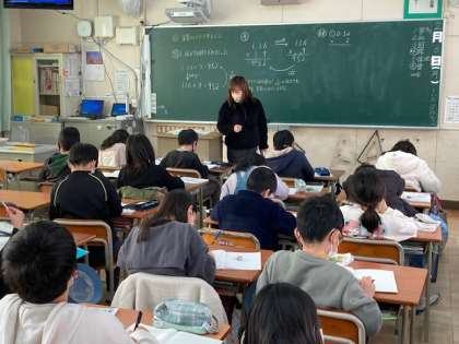 4年生が算数「小数のかけ算とわり算」を学習しています。筆算の仕方を学びました。小数点の位置を考えて計算しました。