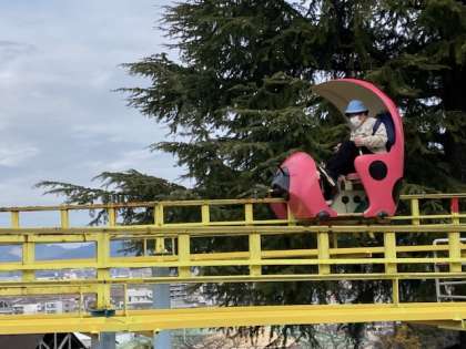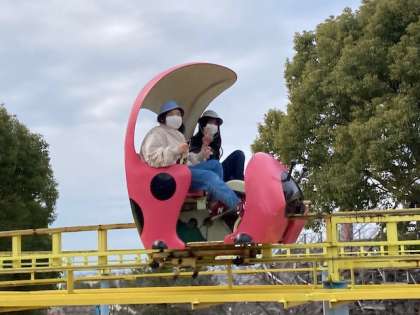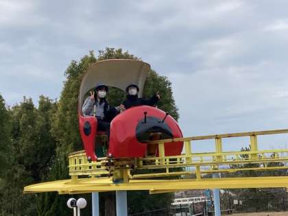 色々なアトラクションを楽しんでいます。青空が見えています。