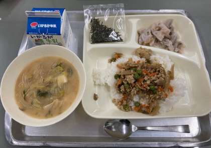 献立は、鶏ごぼうご飯、とうふのみそ汁、焼きれんこん、きざみのり、ご飯、牛乳です。
