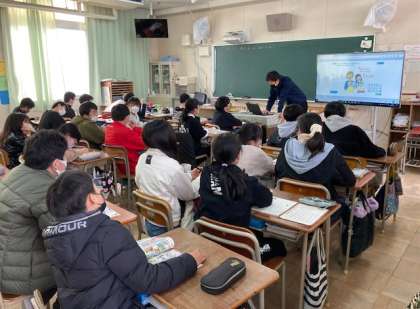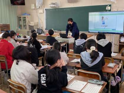 6年生が外国語(英語)の学習で、やってみたい職業を選んで友だちに伝える学習をします。まず、職業名を聴き覚え、その後クイズ形式で順番に職業名を英語で発音しました。