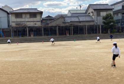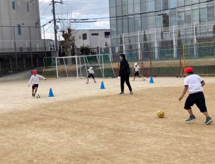 3年生がゴール型ゲームでラインサッカーをします。今日は雨ですボールを足で運べるようにドリブルの練習をしました。両足を使ってドリブルできるように、ボールと体が離れないようにドリブルしました。