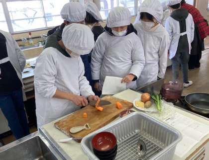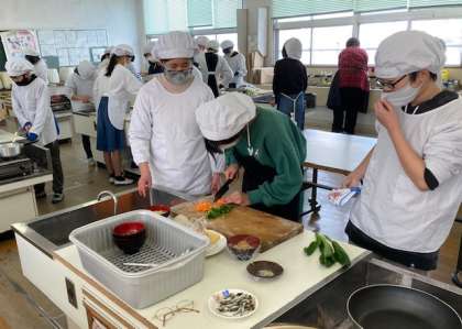 6年生が、みそ汁と青菜と油揚げの炒めものを作りました。みそ汁は、煮干しで出汁をとり、じゃがいもなどの具を入れ、最後に味噌を溶かして作りました。材料を切り、フライパンで油あげを炒め、その後固いものから炒めました。コロナ禍のため、5年生からほとんど調理実習ができませんでした。そのためか、包丁で野菜を切る手つきはぎこちなかったですが、協力してできました。