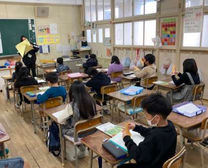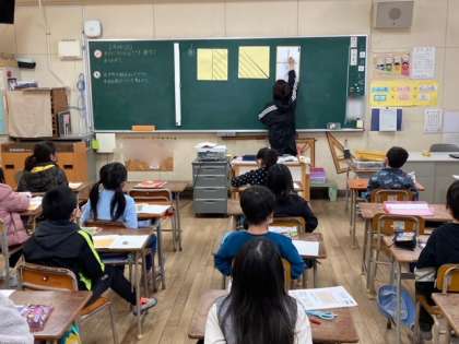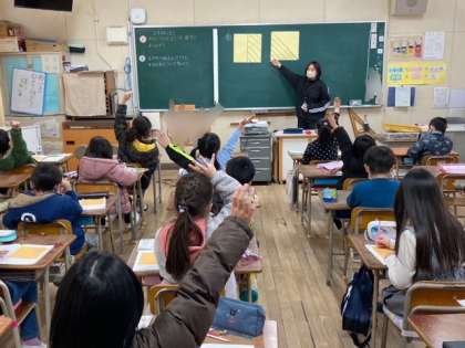 2年生が算数「分数」をはじめて学習しました。半分に分けた大きさを2分の1と言うことや書き方を学びました。