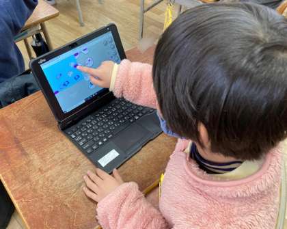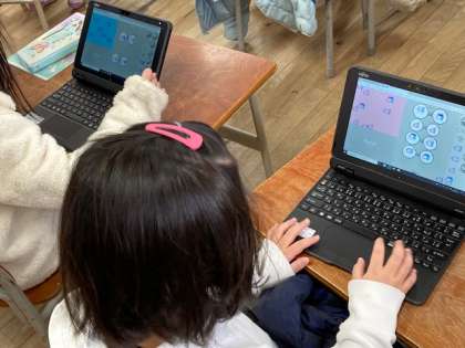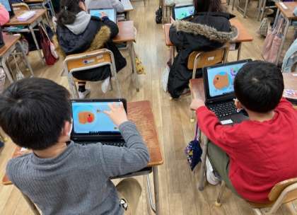 1年生が一人一台端末を活用して、ビスケットをしました。ICT教育アシスタントと担任で指導しました。魚の絵を描き、魚を動かすプログラミングをしました。子どもたちの覚えは早いです。