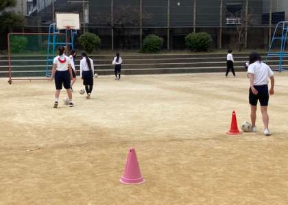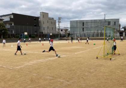 5年生が体育の学習でサッカーに取り組んでいます。ドリブルとシュートの練習をしました。サッカーゴールとして防球ネットを活用して、たくさんシュート練習ができるように工夫しました。