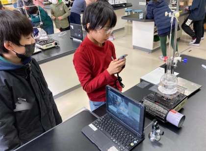 4年生が、理科で水を熱した時の変化を調べました。熱した時間、水の温度、水の様子を記録しました。また、タブレット端末を活用して、水の変化を動画撮影しました。実験の振り返りに使います。