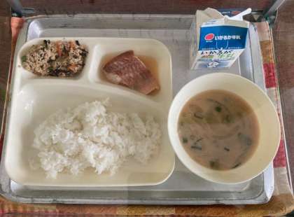献立は、あかうおのレモンじょうゆかけ、みそ汁、高野どうふのいり煮、ご飯、牛乳です。今日の給食では国産のレモンを使用しています。