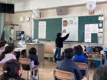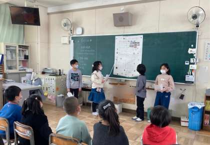 3年の学習参観は、「昔の道具、くらしの移り変わり」のテーマで、調べたことを発表しました。その後、合奏と合唱をしました。