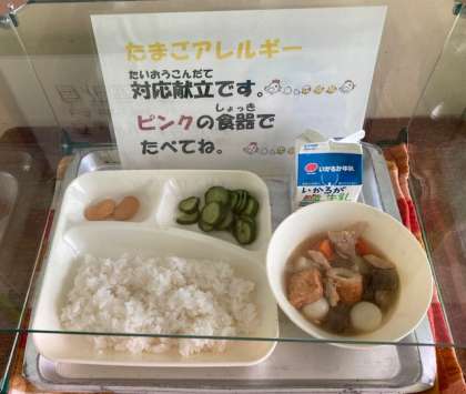 献立は、関東煮、きゅうりの梅風味、白花豆の煮もの、ご飯、牛乳です。本日は食物アレルギー個別対応献立(うずら卵)です。