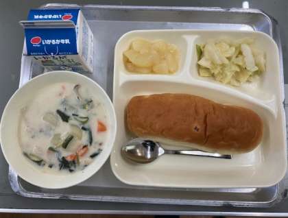 献立は、ほうれんそうのクリームシチュー、キャベツのサラダ、洋なし(カット缶)、おさつパン、牛乳です。
