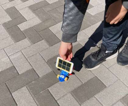 6年生が理科「発電と電気の利用」を学習しています。単元テスト終了後、自力で発電して車を動かしたり、太陽光を集めて発電させて走らせたりしました。