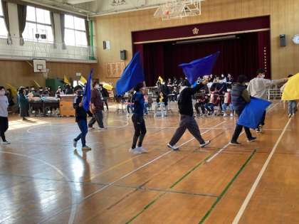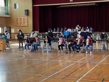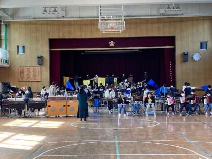 6年生が来週月曜日にある「卒業を祝う会」の練習をしました。合奏に合わせてフラッグの演技をします。マーチングのカラーガードみたいです。当日が楽しみです。さすが6年生の演奏です。