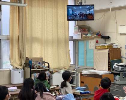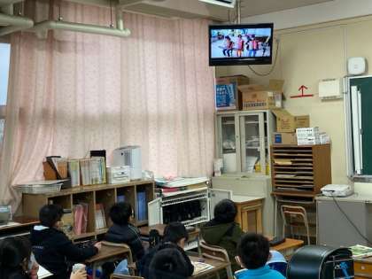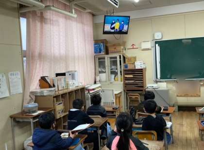 今日の児童集会は、テレビ放送です。広報委員会は活動の様子をクイズ形式で発表しました。音楽クラブは楽器の紹介と合奏をしました。