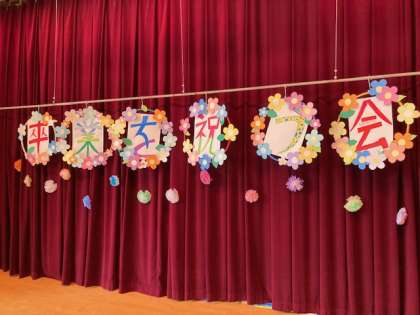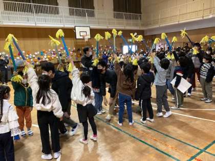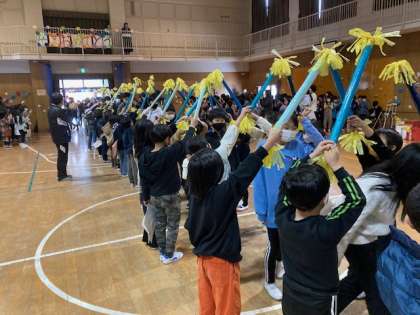 6年生の卒業をお祝いする会をしました。全児童が体育館に集まらずに、6年生が舞台前のひな壇に座り、1年生から順番にお祝いの演奏や合唱、呼びかけをします。会場にはお祝いの飾りがあります。いよいよ1年生が作った花道を6年生が通り、入場しました。