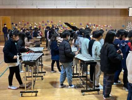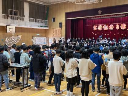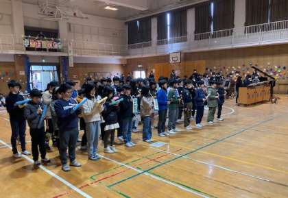 4年生は合奏をしました。打楽器の演奏から始まり、木琴、鉄琴、鍵盤ハーモニカ、リコーダー、ピアノが演奏に加わり、すてきな合奏になりました。