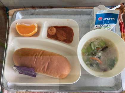献立は、えびのチリソースいため、中華がゆ、デコポン、コッペパン、ブルーベリージャム、牛乳です。