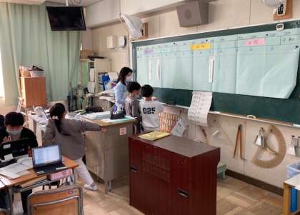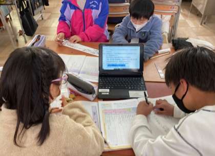 3年生が社会科のまとめとして、大阪市の年表を作成しています。明治から現在までに、大阪市にかかわるできごとを調べ、短冊に書きました。