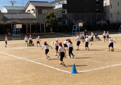 2年2組は、運動場でボールゲームをしました。段ボールにボールを蹴り当てるゲームですが、守りがいますのでなかなか段ボール箱に当たりません。