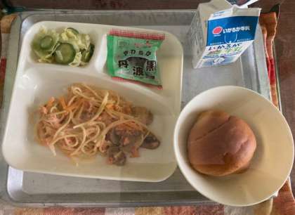 献立は、さけのクリームスパゲッティ、キャベツときゅうりのサラダ、ミニ黒糖パン、ソフトくろまめ、牛乳です。