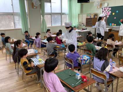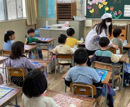 今日から給食が始まりました。1年生の給食は6年生が休み時間に、運んでくれました。6年生、ありがとう。