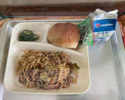 献立は、焼きそば、きゅうりのしょうがづけ、ソフト黒豆、ミニ黒糖パン、牛乳です。