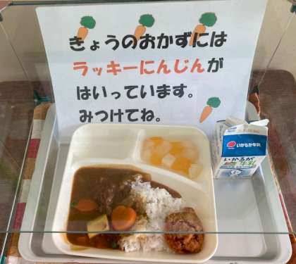 今日の給食は、入学お祝い献立です。カツカレーライス、フルーツゼリー、給食です。ラッキーにんじんが入っていましたが、見つかったかなあ。
