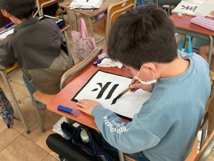 書写で「羊」を書きました。画の長さと間隔に気をつけて書きました。算数は、大きなしくみの学習で、25億の10倍や1/10の数を求めました。