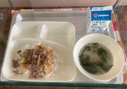 献立は、ビビンバ、トック、ご飯、牛乳です。給食では、週に3回ご飯が出ます。まぜごはんやとんぶりの日もあります。