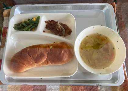 献立は、豚肉のガーリック焼き、スープ、さんどまめとコーンのサラダ、おさつパン、牛乳です。