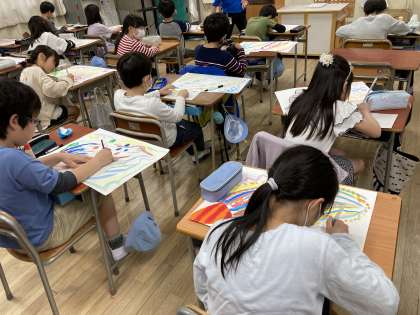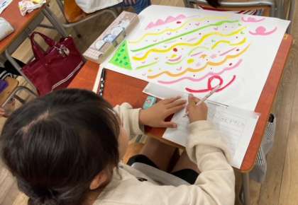 ? 3年生が、クラッカーを鳴らして紙が飛び散る様子を描きました。今日は自分の作品を見て、工夫したことやがんばったことを書きました。