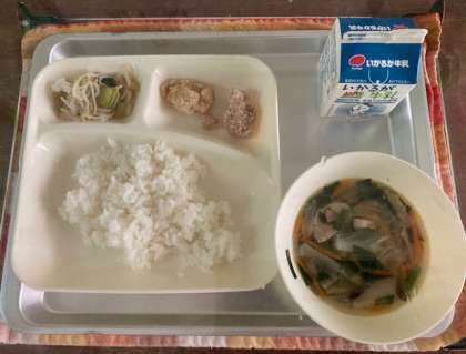 献立は、鶏肉のからあげ、中華スープ、チンゲンサイともやしの甘酢あえ、ご飯、牛乳です。